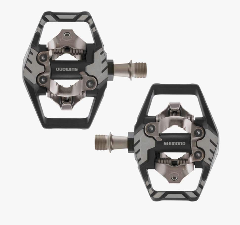 SHIMANO's DEORE XT PD-M8120 trail pedal features enhanced stiffness and stability for rough trails and aggressive riding. A wider and longer contact area provides efficient power transfer and improved bike control. The pedal's integrated cage protects bindings from impacts and acts as a guide for easier engagement.